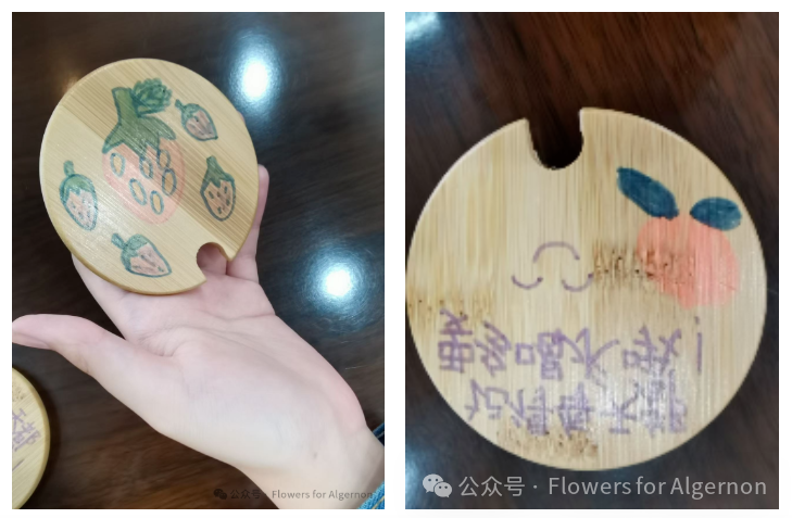 有一个孩子说她最喜欢吃的水果是草莓, 于是在成员的帮助下,画出了一个饱满圆润的大草莓。她又说一定要多吃草莓,便又画了四个, 提醒自己多吃水果。